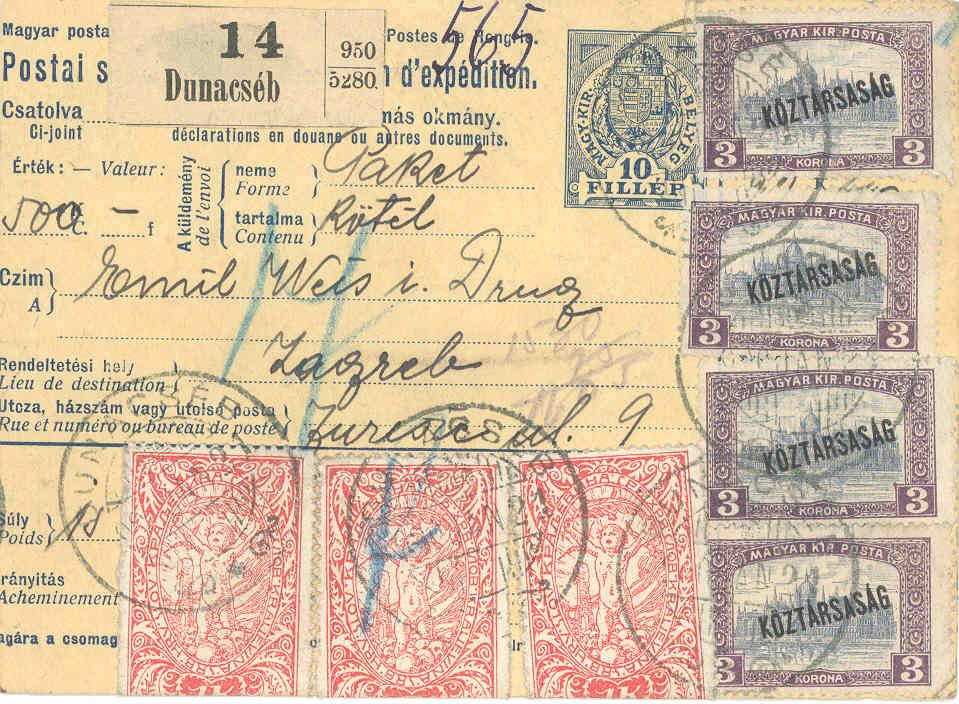 | Postbegleitadresse für Paket aus Čib (Dunacséb), 21.1.1920, nach Zagreb, mit vier Marken zu 3 Korona der ungarischen Parlaments-Ausgabe mit Aufdruck KÖZTÁRSASÁG von 1918 als Aufbrauch neben SHS Marken. |